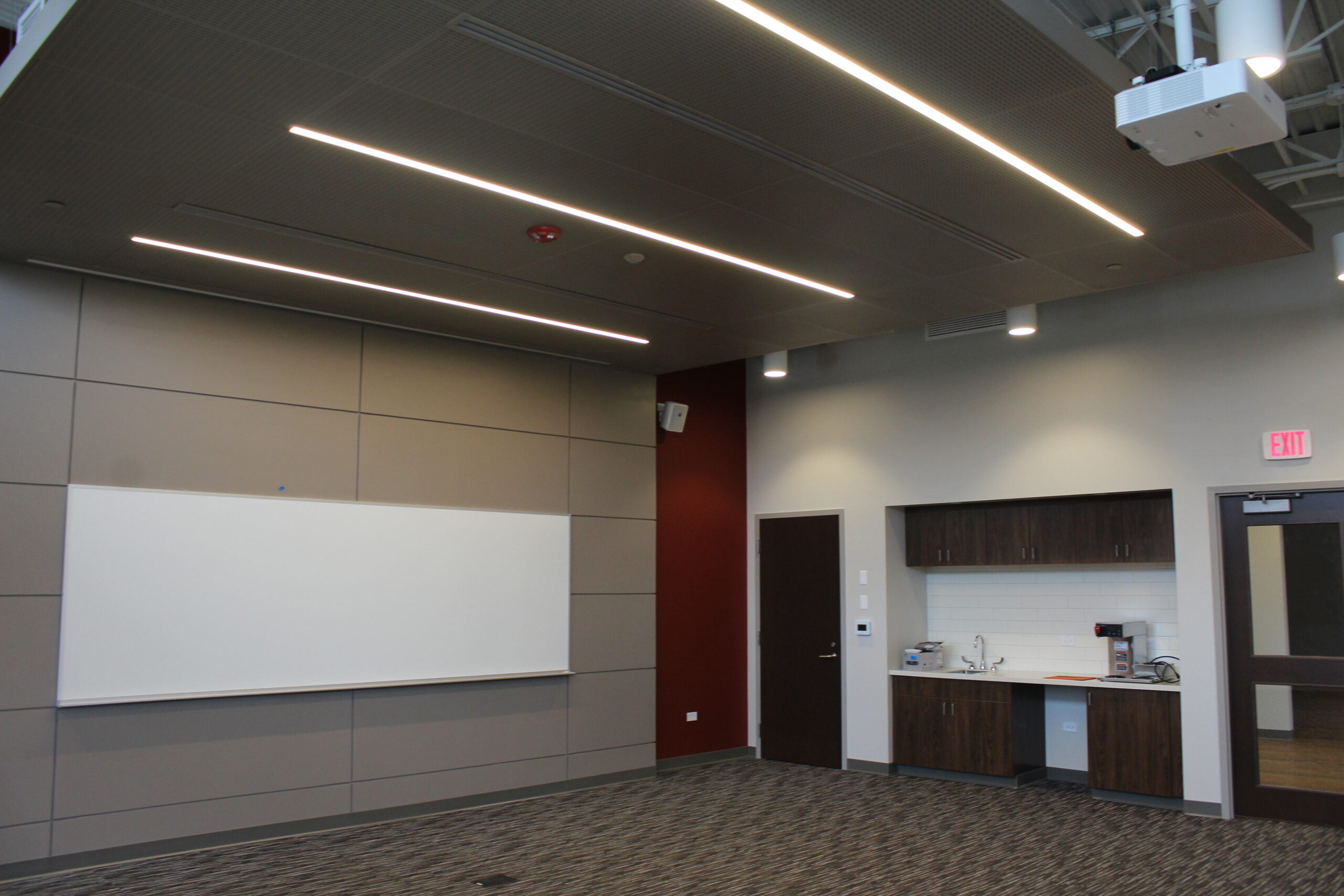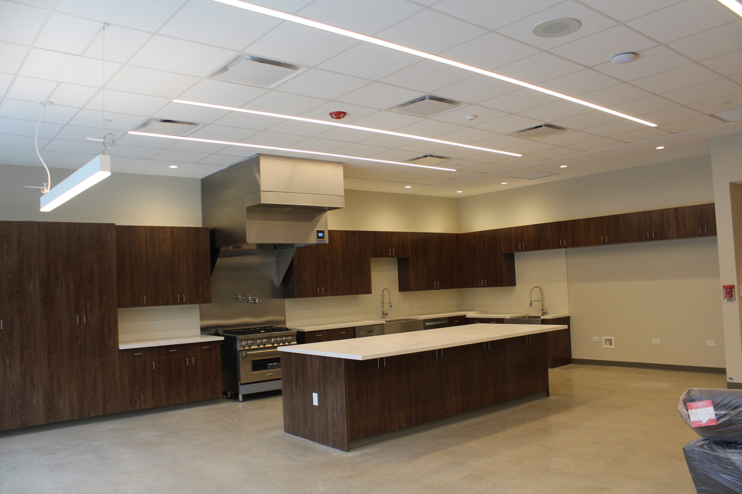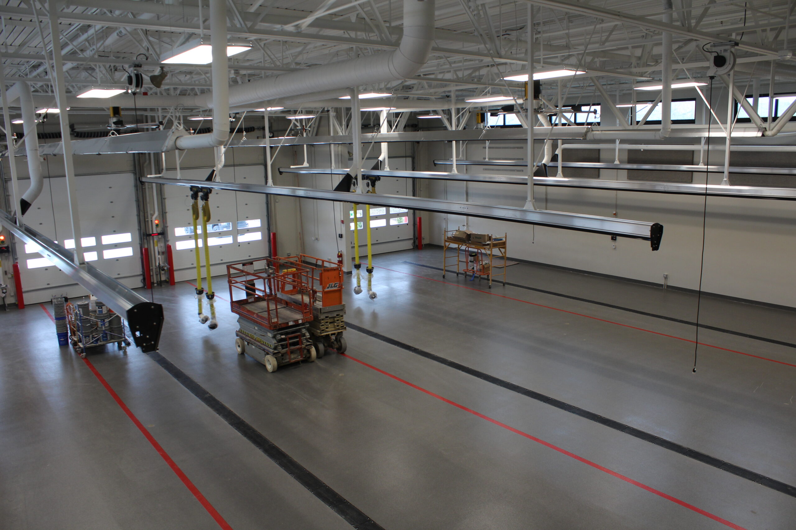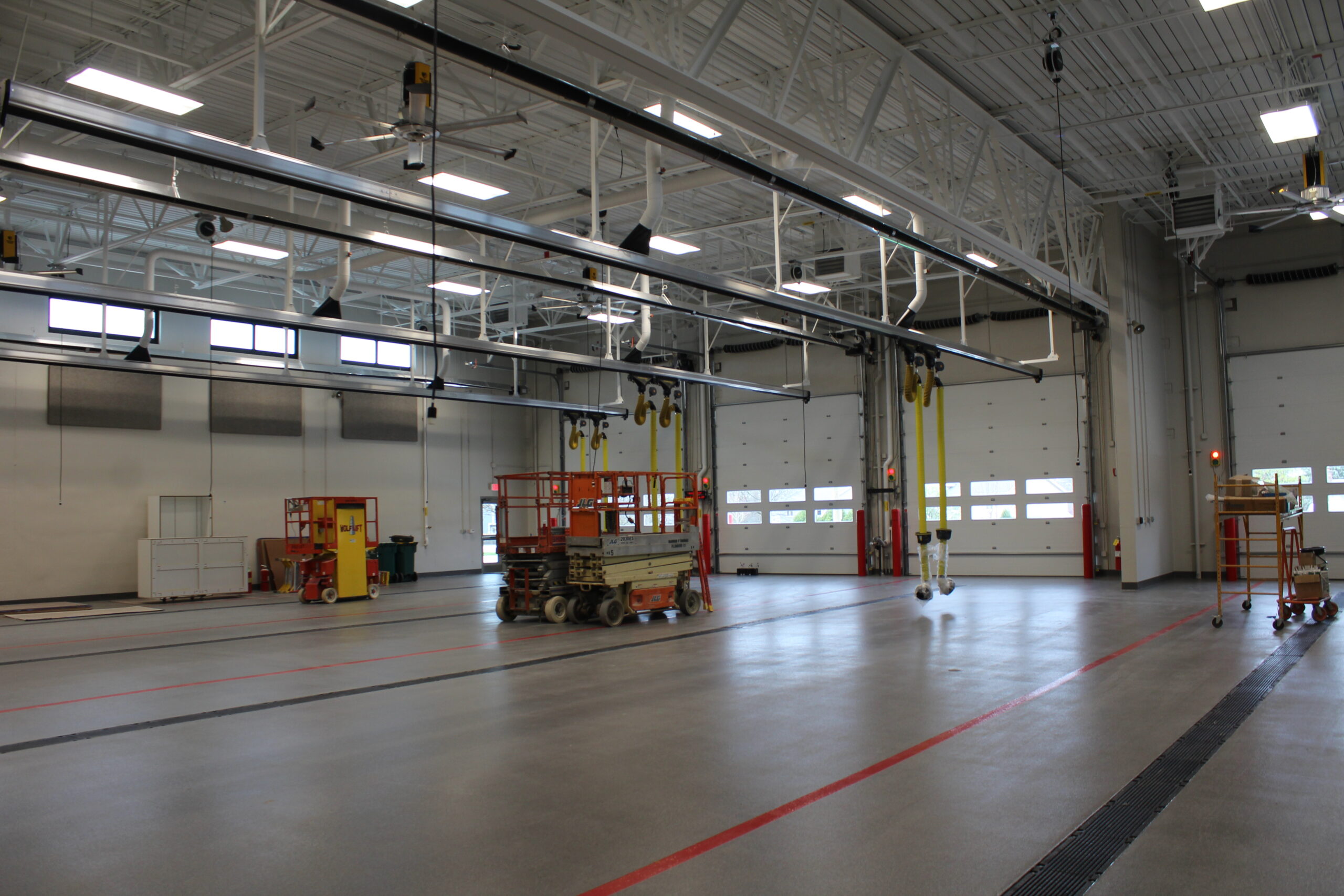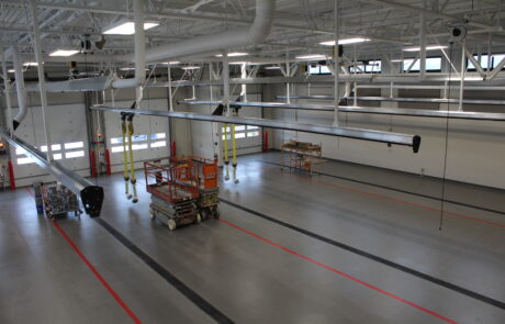 The HVAC system features a high efficiency variable volume and temperature rooftop unit system with DX cooling, natural gas heating, and electric steam humidification for the occupied spaces. Ventilation is provided through the rooftop units, while dedicated exhaust systems serve the commercial kitchen hood, restrooms, and decontamination areas. In the apparatus bays, gas fired infrared tube heaters and high volume, low-speed circulation fans maintain comfort, and a vehicle exhaust removal system with gas detection and ventilation capacity was designed to serve up to seven vehicles simultaneously.
